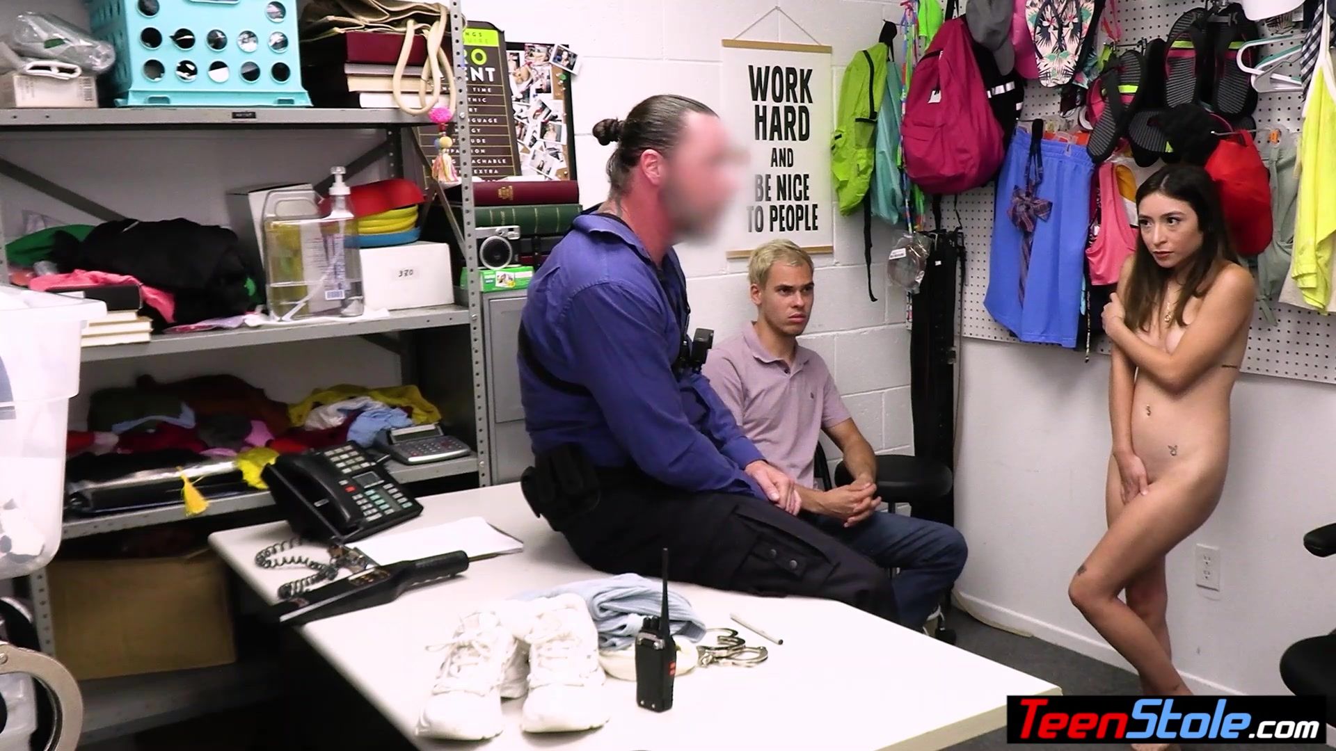LP officer catches a petite latina teen thief Amber Summer and her BF After the questioning he calls her associates and she has to satisfy her lovers and the three guards big dicks to avoid jail So they are fucking her cute face and her pussy hard