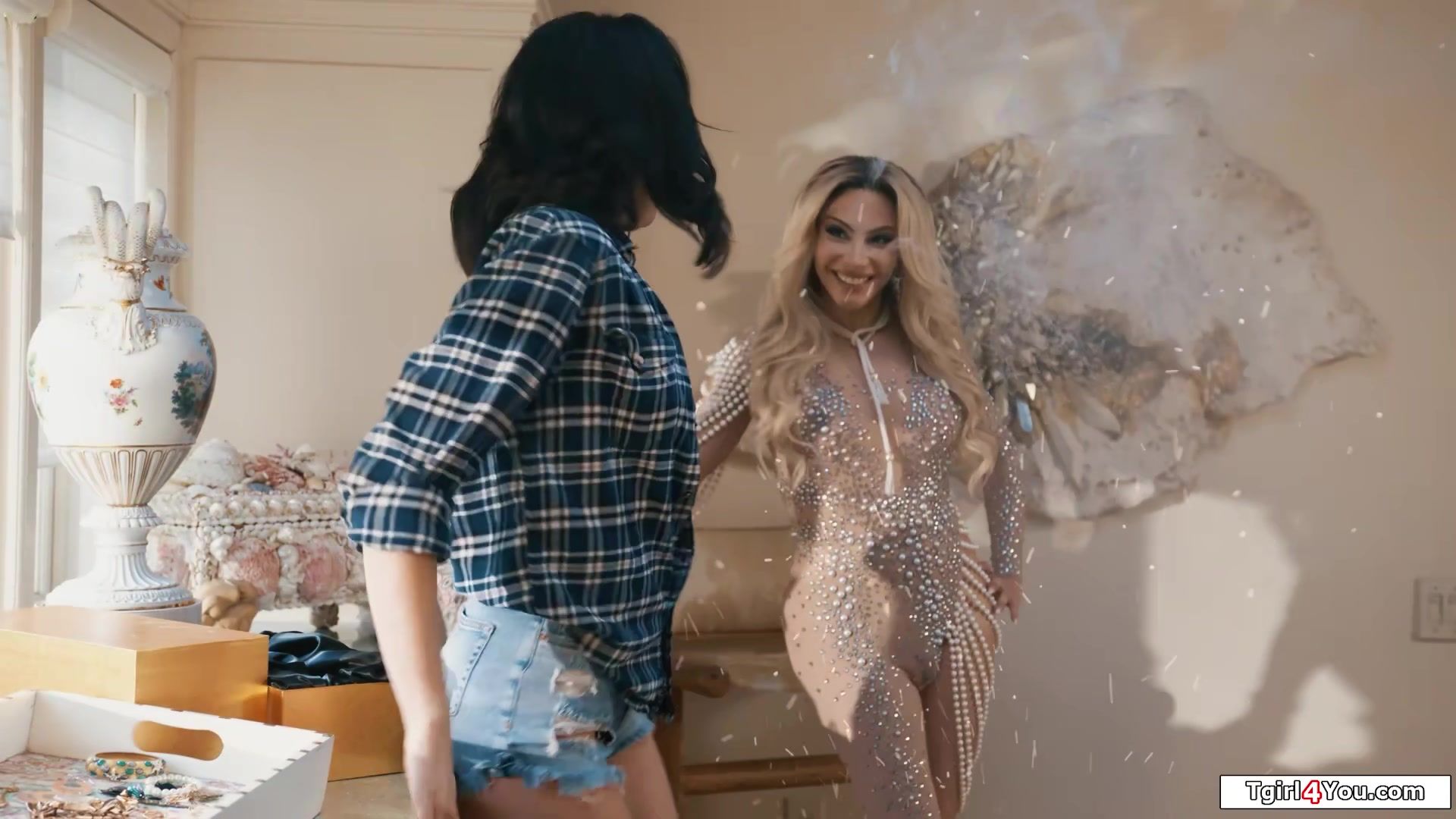 Busty latin shemale fairy Ariel Demure pops out of a diamond and is ready to please Charlotte Sins.The tgirl is kissed while being jerked off.In a 69er the trans licks pussy and is sucked off.The tranny bangs the babe with her big transsexual cock